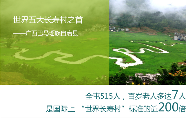 廣西巴馬瑤族自治縣位于廣西盆地和云貴高原的斜坡地帶,總?cè)丝?3萬人。據(jù)廣西巴馬縣民政局消息,截止到2010年6月8日,廣西巴馬瑤族自治縣100歲及以上的長壽老人達87人,每10萬人里有37.826個,是國際長壽村標(biāo)準(zhǔn)的5.043倍。比2000年第五次全國人口普查時74人多13人。是世界五大村中惟一長壽老人不斷增多的地方。被譽為世界五大長壽村之首。其中,一個叫甲篆鄉(xiāng)平安村巴盤屯的地方,全屯515人,百歲老人多達7人,是國際上 “世界長壽村”標(biāo)準(zhǔn)的近200倍。