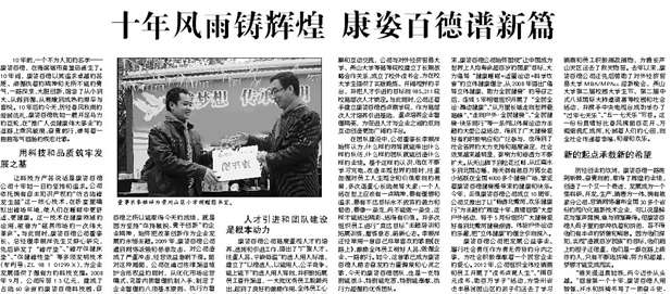 報(bào)道從公司的科研成果、改革創(chuàng)新精神、人才引進(jìn)和團(tuán)隊(duì)建設(shè)、主題活動(dòng)、未來(lái)憧憬等方面,反映了公司成立10年來(lái)所取得的一系列驕人業(yè)績(jī)和公司發(fā)展過(guò)程中形成并堅(jiān)持的品質(zhì)精神、價(jià)值理念、管理運(yùn)營(yíng)模式。這是該報(bào)為公司10周年華誕送上的一份大禮,必將激勵(lì)全體康姿百德人在新的起點(diǎn)上振奮精神、開(kāi)拓進(jìn)取,取得新的更大的業(yè)績(jī)。