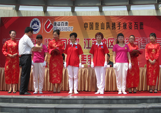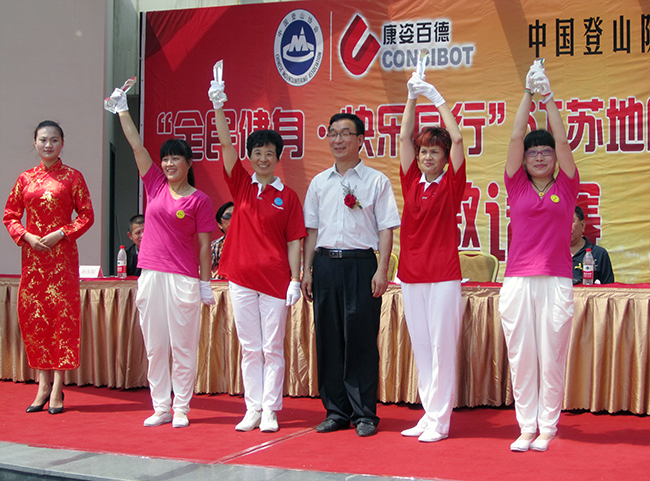 5月25日上午11時,中國登山隊攜手康姿百德舉辦的“全民健身·快樂同行”康姿百德第二套健身操邀請賽江蘇地區(qū)比賽在江蘇太倉舉行。來自江蘇各地區(qū)的18個代表隊共計600余名健身愛好者參加了此次比賽。 參加此次比賽的主要嘉賓有:中國登山協(xié)會副會長楊文祥、原張家港工商局局長焦兀、太倉市城廂鎮(zhèn)工商分局書記楊振華、太倉市保護消費者協(xié)會秘書長鄒雁、太倉曲藝指導委員會秘書長徐兆群、康姿百德公司董事長、總經理李銀祥等。 中國登山隊攜手康姿百德“全民健身·快樂同行”大型公益活動,于2012年在全國開展以來,受到了社會各方面的廣泛關注。為了將“全民健身·快樂同行”大型公益活動進一步引向深入,讓更多的人走出家門,參加全民健身運動,中國登山隊,秦皇島康姿百德高新技術開發(fā)有限公司,決定聯(lián)合舉辦“全民健身·快樂同行”康姿百德健身操邀請賽,江蘇地區(qū)是本次邀請賽初賽的第一站。 在比賽中,身著紅色演出服的青年歌手楊德朗站在車上出場,演唱了他的原創(chuàng)歌曲《最美中國人》。這首歌曲是康姿百德第二套健身操的背景音樂之一,全體參賽的健身愛好者隨著音樂而舞動,統(tǒng)一的著裝、整齊的動作、飽滿的熱情,將本次比賽推向了高潮。 經評比,18個代表隊分獲“最佳表演獎”、“團隊建設獎”、“最佳組織獎”等獎項,這些健身操愛好者將在9月份來到秦皇島參加“全民健身·快樂同行”康姿百德健身操邀請賽的展演,勢將引起新一輪的康姿百德健身熱潮。