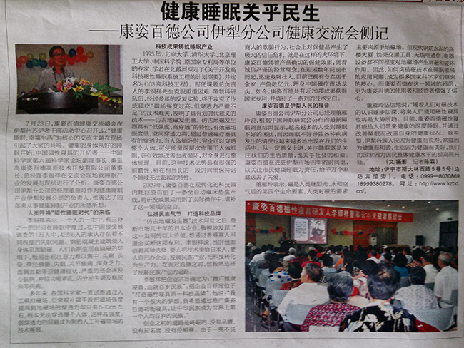 7月23日,康姿百德健康交流盛會在新疆伊犁州蘇伊老干部活動中心舉行,以“健康睡眠、幸福生活”為核心的交流主題引起了與會代表的共鳴。中國磁性寢具的開拓者—第六屆中國科學家論壇副理事長、秦皇島康姿百德高新技術開發(fā)有限公司董事長、總經(jīng)理李銀祥就健康睡眠產(chǎn)業(yè)的發(fā)展與現(xiàn)狀進行了深入分析。康姿百德公司伊犁分公司總經(jīng)理董雁玲向與會代表交流了從事健康睡眠產(chǎn)業(yè)四年來的所感所想。7月24日《伊犁晚報》對此次會議作了題為“健康睡眠、關乎民生”的專題報道。