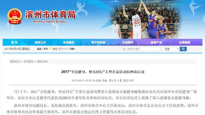 山東濱州體育局登載康姿百德健身操展演活動(dòng)信息