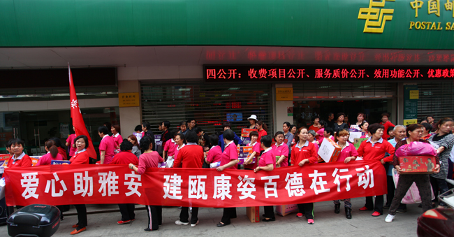 雅安地震的消息一經(jīng)傳出,建甌康姿百德體驗(yàn)店自發(fā)組織捐物資活動,體驗(yàn)店顧客及熱心群眾共計(jì)200余人參加了此次捐助活動,他們打著“愛心助雅安,建甌康姿百德在行動”的條幅,親手把愛心物資送到郵局,一路上引來不少群眾圍觀,許多熱心群眾也紛紛慷慨解囊,捐款捐物。據(jù)統(tǒng)計(jì),此次捐贈的方便面、棉被、礦泉水等愛心物資共計(jì)6萬余元,通過郵寄方式把愛心送到雅安。