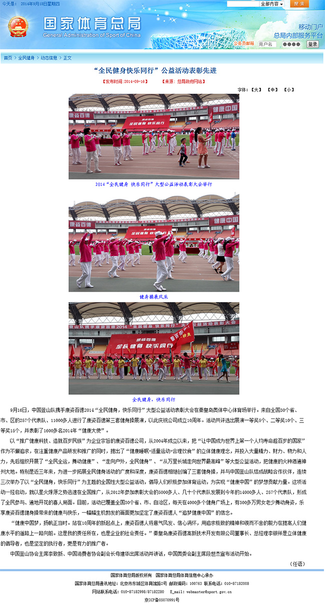 國(guó)家體育總局官網(wǎng)以《“全民健身快樂(lè)同行”公益活動(dòng)表彰先進(jìn)》為題,對(duì)中國(guó)登山隊(duì)攜手康姿百德2014“全民健身 快樂(lè)同行”大型公益活動(dòng)表彰大會(huì)進(jìn)行報(bào)道。
