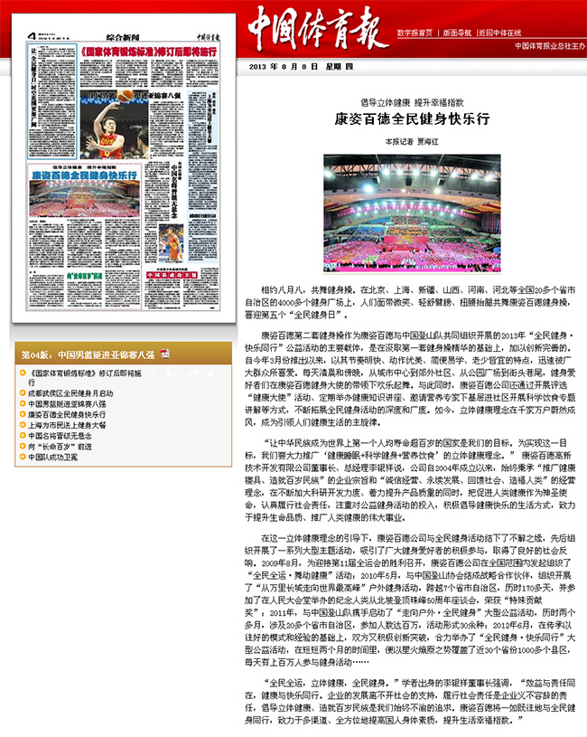 2013年8月8日,在第五個“全民健身日”到來之際,《中國體育報》以《倡導(dǎo)立體健康,提升幸福指數(shù)——康姿百德全民健身快樂行》為題,對康姿百德公司“全民健身·快樂同行”大型公益活動進(jìn)行了專題報道。這是繼去年8月8日、今年3月9日之后,《中國體育報》第三次對康姿百德公司全民健身活動進(jìn)行的專題報道。