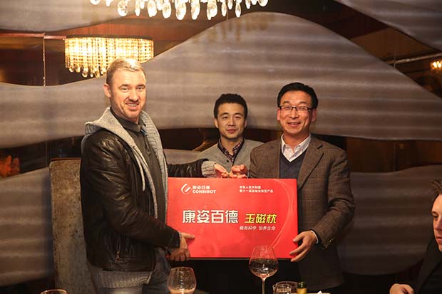 總決賽結(jié)束,我公司董事長、總經(jīng)理李銀祥出席了選手們的慶功宴會,對選手們精湛的球技和出色的表現(xiàn)表示欣賞和贊許。宴會期間,李銀祥還向“臺球皇帝”亨德利贈送了康姿百德玉磁紀(jì)念枕,并手捧精心制作的印有康姿百德LOGO的工藝品與亨德利合影留念。