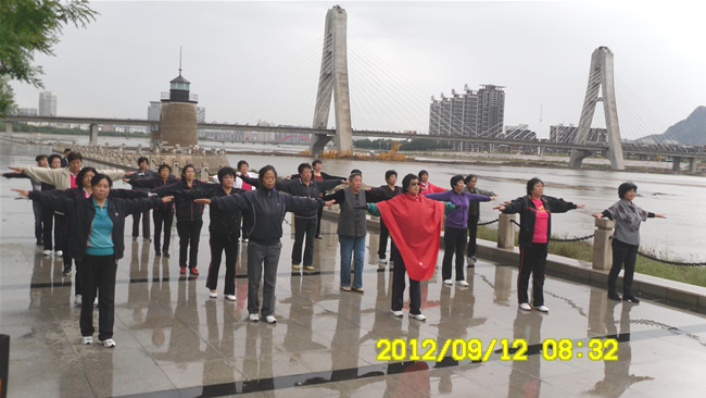 2012年9月12日,天空下著蒙蒙細雨,在遼寧朝陽大凌河畔照例響起了動感的音樂,伴隨著節(jié)奏,有這樣一群中老年人,時而胳膊上揚,時而屈腿下蹲,時而左右擺動,時而前后擊掌……他們在干什么?下雨天不是應(yīng)該躲在家里看看電視、搓搓麻將、打打撲克嗎?為什么他們卻冒雨在明快節(jié)奏中舞動…… 原來,這是一隊康姿百德健身操愛好者。近日,不管是炎炎烈日下,還是蒙蒙細雨中,都從不間斷練習。2012年8月8日《中國體育報》刊登了一則新聞,報道將于9月23日舉辦全國康姿百德健身操精彩展演活動??吹竭@則消息后,遼寧朝陽的康姿百德健身操愛好者們就踴躍報名,組建隊伍精心備戰(zhàn)。參賽者們不僅參加每天晚上集體的健身操活動,并且還要每天堅持2個小時的集訓(xùn)。在集訓(xùn)指導(dǎo)老師分解動作教學后,這些參賽者更是信心倍增。 9月12日,從夜間到清晨雨水不斷,但是上午8時,參賽者們卻依然頂著雨打著傘來到了訓(xùn)練場地,因為打傘練操不方便,阿姨們放下傘頂著雨一遍一遍的做著重復(fù)的動作,只為把每一個動作做得更好。只要音樂不停,即使雨再大,她們的動作也不會停止。隊員們有一個共同的信念:展示最美朝陽人。 對于參加這次健身操比賽,隊員們的態(tài)度都很積極,這是她們代表朝陽人第一次走出去,名次雖不重要,但要展現(xiàn)出朝陽人的風采,展現(xiàn)出自己最好的一面。