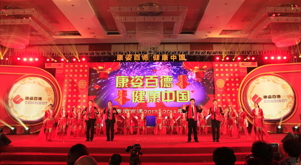 中午1時(shí)許,從全國各地趕來參加年會(huì)的經(jīng)銷商蜂擁而至。會(huì)場門前,由公司督導(dǎo)師組成的禮儀隊(duì),身著禮服,面帶微笑,列隊(duì)歡迎大家的到來,一句句“過年好”、“歡迎您回家”、“您辛苦了”的問候聲不絕于耳。會(huì)場內(nèi),由公司員工自己搭建的舞臺(tái)燈光閃爍,絢麗多彩,懸掛于舞臺(tái)兩側(cè)的大紅燈籠顯得格外耀眼;舞臺(tái)背景的LED屏幕上,“康姿百德、健康中國”、“康姿百德2013-2014年會(huì)”等字幕交替顯示;偌大的大廳內(nèi),40張餐桌上擺滿了水果、瓜子、花生、飲料……。大家邊吃邊聊,噓寒問暖,徜徉在幸福和愉悅之中,盡情享受著家一般的親切和溫暖。