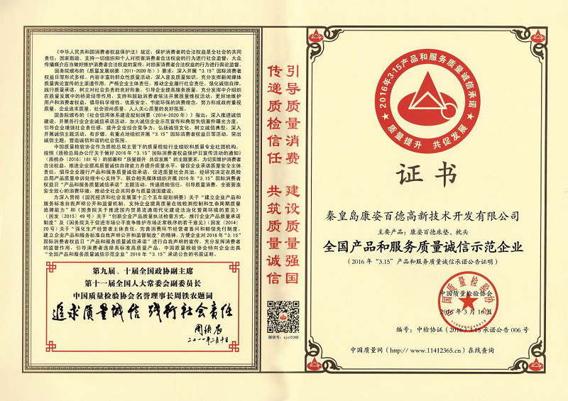此外,康姿百德還分別榮獲3.15主題活動中“全國產品和服務質量誠信示范企業(yè)”、“全國質量檢驗穩(wěn)定合格產品”兩項榮譽。
