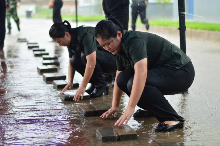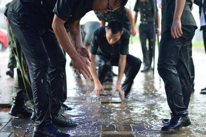雨勢(shì)過(guò)大,腳下的路亦要守護(hù),一鼓作氣,徒手為學(xué)員們搭建愛(ài)心之路。