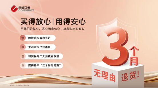 “三個月無理由退貨”承諾遠(yuǎn)高于《消費者權(quán)益保護法》要求的七日內(nèi)無理由退貨,也大大增加了企業(yè)的經(jīng)營成本和難度,但康姿百德仍堅持將消費者的權(quán)益放在首要位置。這充分表明了企業(yè)對消費者高度負(fù)責(zé)的態(tài)度,展現(xiàn)了康姿百德對產(chǎn)品和服務(wù)的自信。同時,在銷售產(chǎn)品的過程中,康姿百德更是主動與消費者簽訂《三個月無理由退貨協(xié)議》,這一舉動也進一步提升了廣大消費者的安全感和滿意度。