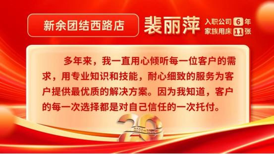 今年是康姿百德集團(tuán)成立20周年。在20年的發(fā)展歷程中,有這樣一群人,他們在市場經(jīng)營管理過程中,深刻貫徹以客戶為中心的理念,始終把優(yōu)質(zhì)的服務(wù)融于門店經(jīng)營的每個(gè)環(huán)節(jié),也因此得到了客戶的贊賞和認(rèn)可。他們就是康姿百德專賣店的員工。本期和您分享的是康姿百德江西地區(qū)專賣店員工代表的故事。