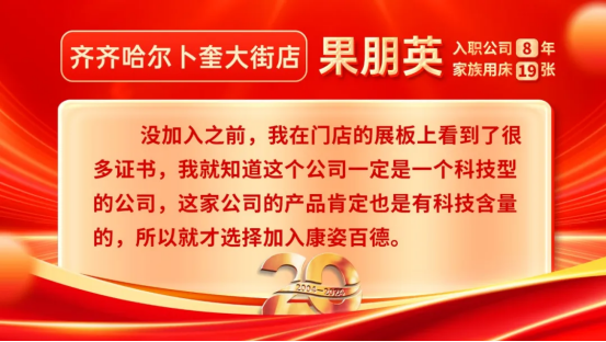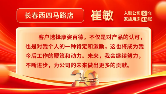 康姿百德20周年專賣店員工的系列故事會(huì)持續(xù)推出,讓我們一起期待其他地區(qū)專賣店員工代表的精彩故事吧!