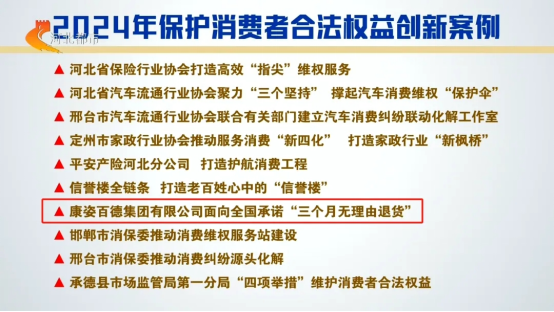 3月15日晚,河北廣播電視臺聯(lián)合河北省市場監(jiān)督管理局、河北省消費者權益保護委員會、全國16省市電視臺推出的3·15特別節(jié)目中,河北省消費者權益保護委員會秘書長  王守用現(xiàn)場宣布了2024年保護消費者合法權益創(chuàng)新案例??底税俚录瘓F有限公司面向全國承諾“三個月無理由退貨”,成功入選。