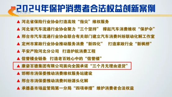 2025年3月15日,康姿百德集團(tuán)有限公司面向全國承諾“三個(gè)月無理由退貨”成功入選河北省消保委評選的“2024年保護(hù)消費(fèi)者合法權(quán)益創(chuàng)新案例”,并被河北省消保委作為典范,向全社會(huì)推廣。