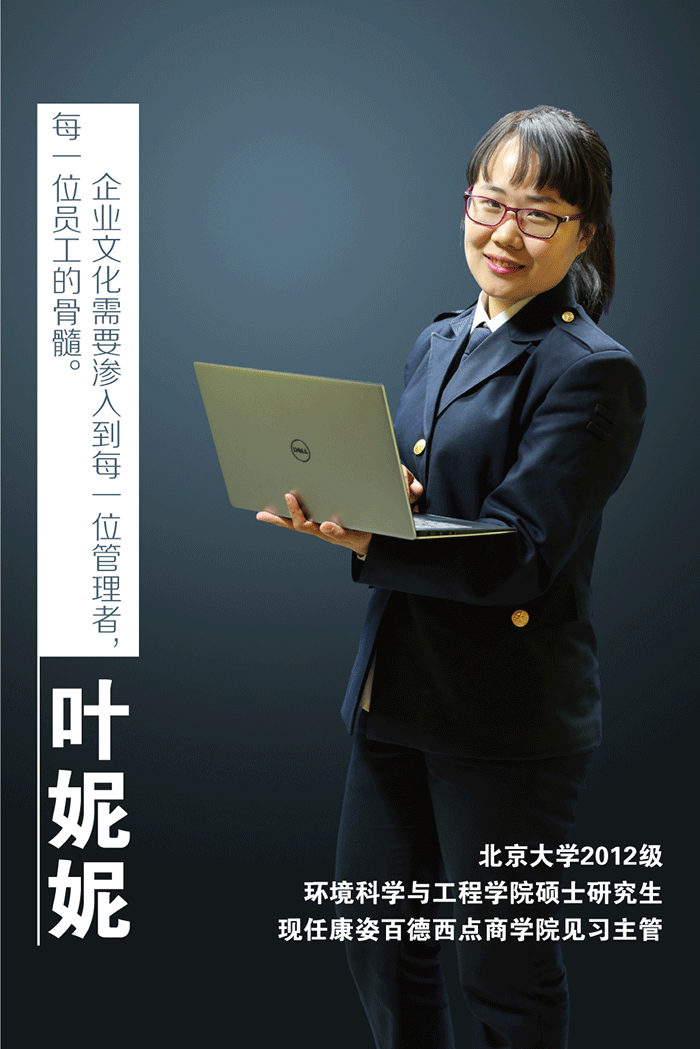 葉妮妮,北京大學(xué)2012級(jí)環(huán)境科學(xué)與工程學(xué)院碩士研究生,現(xiàn)任康姿百德西點(diǎn)商學(xué)院見習(xí)主管。